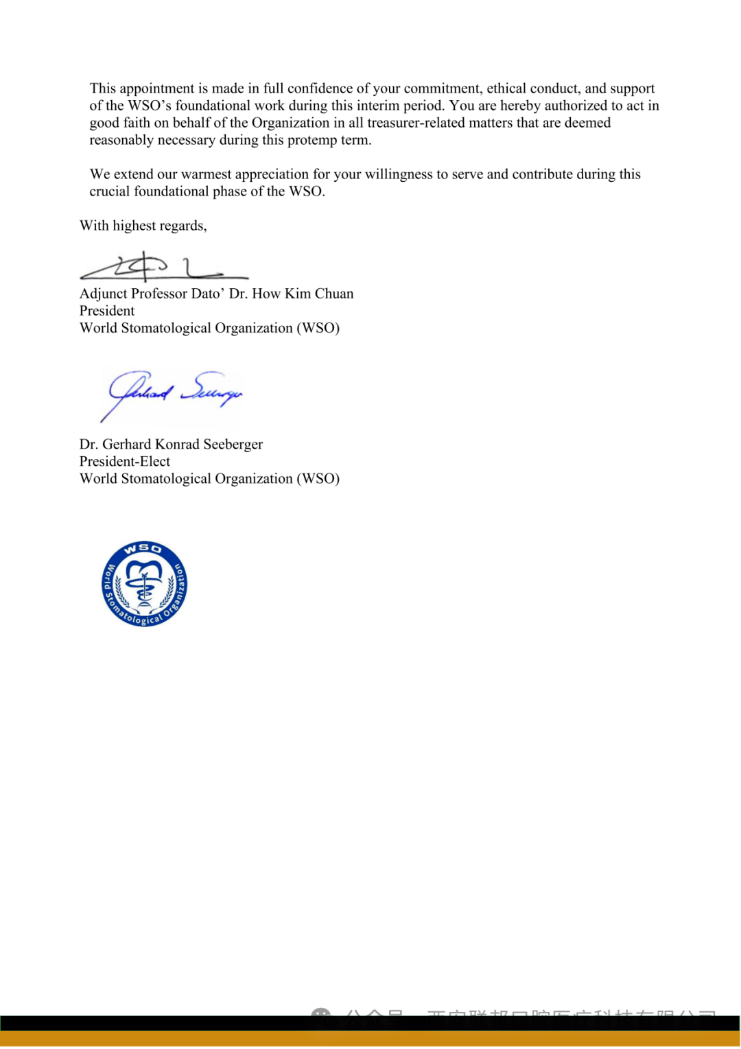 世界口腔醫(yī)學(xué)組織(WSO)財(cái)務(wù)主管臨時(shí)委任函